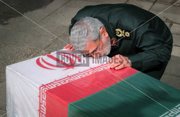 Headline: Iran's Supreme Leader Ayatollah Ali Khamenei Prays At Coffin Of The IRGC General Moussav
