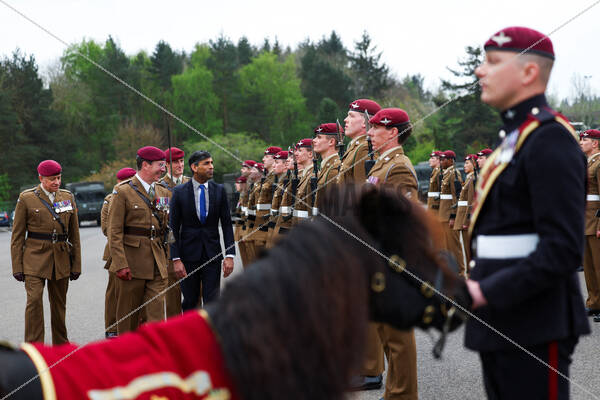 Caption: Prime Minister Rishi Sunak stands near the Shetland pony called "Pegasus V" as he inspects the Passing Out Parade of the Parachute Regiment recruits during his visit to the Helles Barracks at the Catterick Garrison in North Yorkshire
