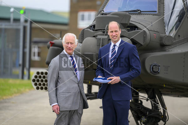 Caption: Official handover in which King Charles III passes the role of Colonel-in-Chief of the Army air corps to Prince William, Prince of Wales at the Army Aviation Centre in Stockbridge, Hampshire