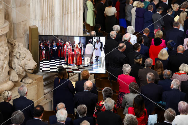 Caption: King Charles III and Queen Camilla are seen on the screen as they take part in a service for the Order of the British Empire at St Paul's Cathedral, London, which recognises the work of people from all walks of life who have received honours
