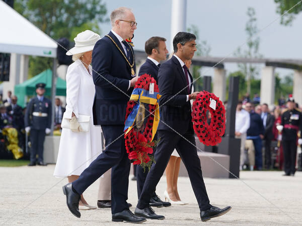 Caption: Jason Coward, National Chair, Royal British Legion, and Prime Minister Rishi Sunak lay wreaths during the UK national commemorative event for the 80th anniversary of D-Day, held at the British Normandy Memorial in Ver-sur-Mer, Normandy, France