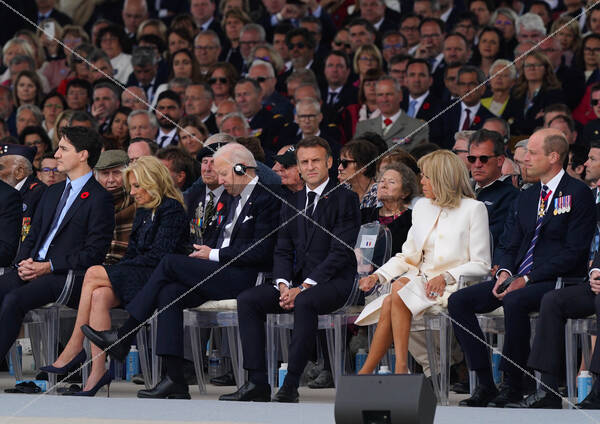 Caption: (Front row left to right) Canadian Prime Minister Justin Trudeau, first lady Jill Biden, US President Joe Biden, President of France Emmanuel Macron, his wife Brigitte Macron and The Prince of Wales attending the official international ceremony to mark the 80th anniversary of D-Day, at Omaha Beach in Saint-Laurent-sur-Mer, Normandy, France, joining over 25 heads of state and veterans from around the world