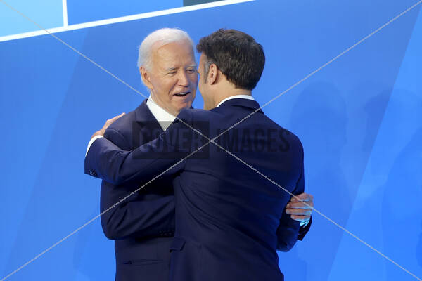 Caption: United States President Joe Biden, left, and Emmanuel Macron, France's president, participate in a welcome handshake during the NATO Summit in Washington, DC, US, on Wednesday, July 10, 2024. President Joe Biden and NATO's 31 other leaders had hoped their summit would celebrate fresh unity against Russia's Vladimir Putin, send a warning to China and prove the alliance is as strong as ever in its 75th year, but the three days of pageantry will be overshadowed by domestic turmoil across the alliance. Credit: Ting Shen / Pool via CNP