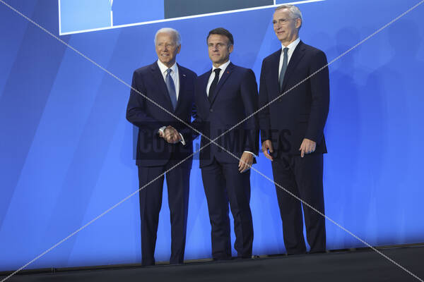 Caption: United States President Joe Biden, from left, Emmanuel Macron, France's president,, and Jens Stoltenberg, secretary general of the North Atlantic Treaty Organization (NATO), participate in a welcome handshake during the NATO Summit in Washington, DC, US, on Wednesday, July 10, 2024. President Joe Biden and NATO's 31 other leaders had hoped their summit would celebrate fresh unity against Russia's Vladimir Putin, send a warning to China and prove the alliance is as strong as ever in its 75th year, but the three days of pageantry will be overshadowed by domestic turmoil across the alliance. Credit: Ting Shen / Pool via CNP