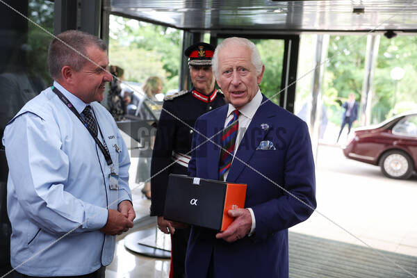 Caption: King Charles III receives a camera during a visit to the Sony UK Technology Centre in Pencoed Technology Park, Bridgend, to mark its 50th anniversary. Approximately 600 employees work on the campus, focussing on fields such as Design for Assembly, Advanced Manufacturing and Research and Development