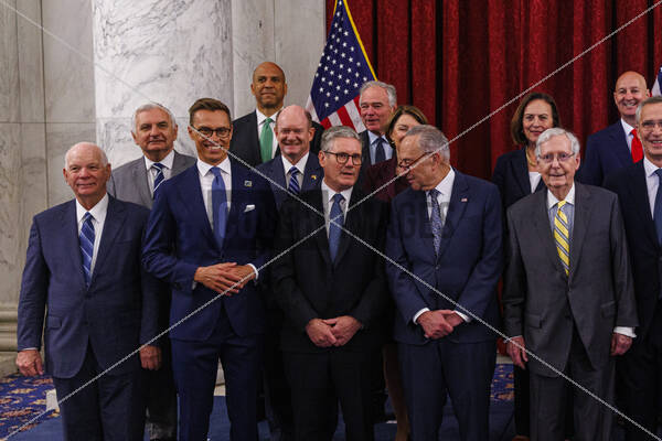 Caption: A bipartisan group of US Senators pose for a photo with various leaders of NATO countries, (left to right) United States Senator Ben Cardin (Democrat of Maryland), Finnish President Alexander Stubb, United Kingdom Prime Minister Keir Starmer, United States Senate Majority Leader Chuck Schumer (Democrat of New York) and United States Senate Minority Leader Mitch McConnell (Republican of Kentucky).