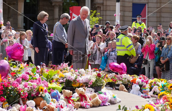 Caption: King Charles III views the flowers and tributes outside the Atkinson Art Centre Southport ahead of his to meet members of the Southport community following the July 29th knife attack in the town, during which three young girls were killed