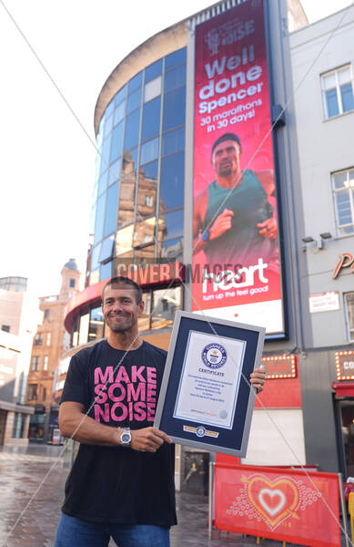 Caption: Spencer Matthews outside Global LSQ screens in London to celebrate 30 marathons in 30 days challenge and his Guinness World Record, in aid of Global's Make Some Noise.