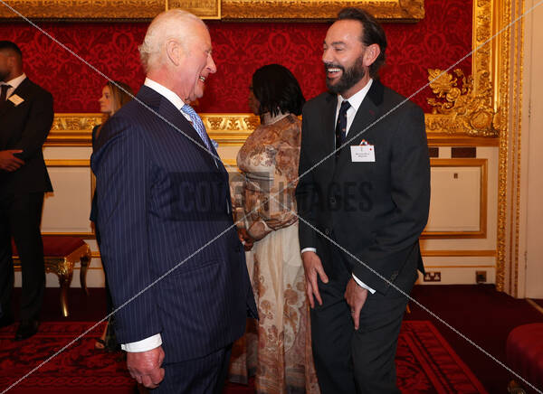 Caption: King Charles III talks with Craig Revel Horwood during a reception at St. James's Palace in London, to celebrate the Commonwealth Diaspora, ahead of the Commonwealth Heads of Government Meeting in Samoa