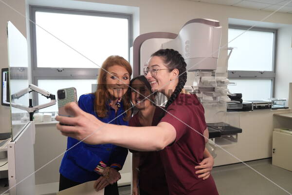 Caption: Sarah, Duchess of York, who is to be made a patron of charity Prevent Breast Cancer, poses for a selfie with Lisa Thomas (centre) and Kate Schofield (right), during a visit to the Prevent Breast Cancer headquarters at the Nightingale Centre, Wythenshawe Hospital, in Manchester. The Duchess of York was diagnosed with malignant melanoma skin cancer, just months after facing breast cancer, and was later given the all-clear after treatment.