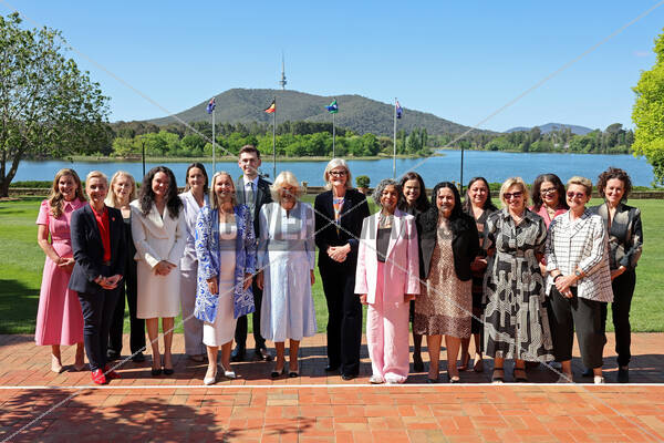Caption: Queen Camilla, patron of GIVIT, Governor-General of the Commonwealth of Australia, Sam Mostyn and GIVIT staff and volunteers pose for a group picture outside the Banksia Centre at the National Botanic Gardens during a visit to meet GIVIT staff and volunteers to recognise the organisation's work supporting the needs of Australians with the donation of essential items and services to people experiencing hardship, on day two of the royal visit to Australia and Samoa.