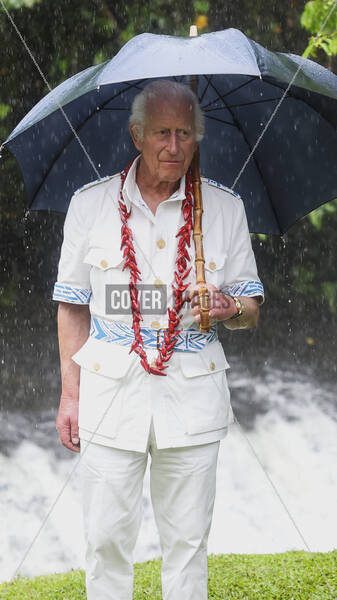 Caption: King Charles III stands next to a waterfall as he uses an umbrella to shelter from the rain during his visit to O Le Pupu'Pue National Park, Sa'agafou on the island of Upolu, to meet local villagers and community groups involved in the reforestation efforts on day five of the royal visit to Australia and Samoa