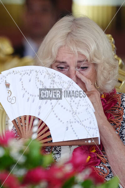 Caption: Queen Camilla wipes her eye after crying with laughter during a farewell ceremony at Siumu Village on the final day of the royal visit to Australia and Samoa