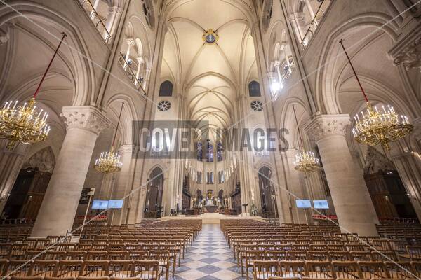 Caption: First inaugural mass at Notre Dame Cathedral, where giant screens are displayed around Notre Dame Cathedral. The beloved Paris monument nearly burned down in 2019, but has been renovated inside and fitted with a new roof and spire during a frenzied reconstruction effort since then.