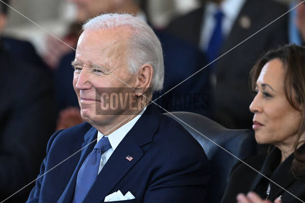 Caption: (L-R) Former US President Joe Biden and former Vice President Kamala Harris listen as President Donald Trump speaks after being sworn in as the 47th President in the US Capitol Rotunda in Washington, DC