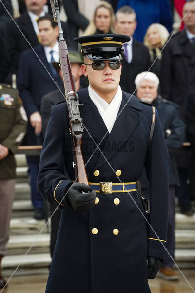 Caption: A Tomb Sentinels at the Tomb of the Unknown Soldiers conduct a “Changing of the Guard” ceremony at Arlington National Cemetery January 19, 2025. The Tomb Guards have conducted uninterrupted 24 hour operations, year round since 1937 to maintain security and honor at the Tomb.