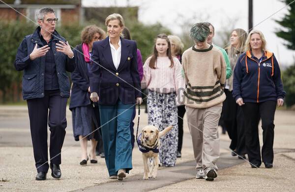 Caption: The Duchess of Edinburgh (2nd left) walks assistance dog Clover, alongside CEO of Dogs for Autism Hilary Armour (left) and Holly Butler (2nd right) during a visit to Dogs for Autism in Alton, Hampshire, the first charity exclusively providing autism assistance dogs
