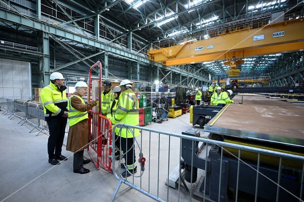 Caption: King Charles III speaks to workers during a visit to SeAH Wind's XXXL offshore turbine base factory at Teesside's Freeport in Middlesbrough, which is due for completion in early 2025. It is the world's largest monopile manufacturing facility to date