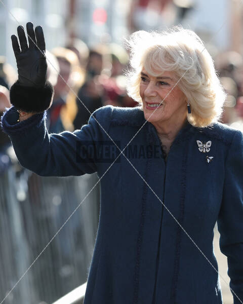 Caption: Queen Camilla waves to the crowd during a visit to Middlesbrough's International Centre to meet representatives of local community groups, voluntary services and police officers working to reduce knife crime in the town
